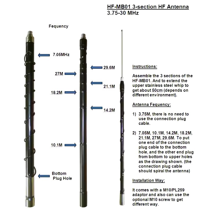 Секції антени виготовлені з епоксидно-склокомпозитного матеріалу, а гвинтові з’єднання – з нержавіючої сталі. Антени дуже легкі, але, з іншого боку, вони дуже стійкі до будь-яких погодних умов. Фланець на опорному типу виготовлений зі спеціального поліаміду та алюмінію з чудовими механічними характеристиками. Антени HF–MB01 призначені в основному для використання на всіх типах суден, нафтових вишках і т.д. Вони також можуть використовуватися на наземних об’єктах для стаціонарного використання. У такому випадку необхідно замовити спеціальний дротовий заземлювач.